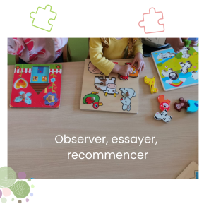 Les temps de motricité, les jeux d’encastrement, les activités sensorielles ou encore les moments d’exploration libre permettent à chacun d’avancer à son rythme, en fonction de ses besoins et de ses envies.